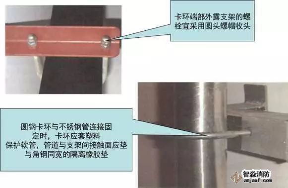 選擇與管徑匹配的卡環,卡環安裝固定螺栓孔應保證管道順直且居卡環中間,卡環與管道應接觸緊密。圓鋼卡環與不銹鋼管、銅管連接固定時,卡環應套塑料保護軟管,管道與支架間接觸面應墊與角鋼同寬的隔離橡膠墊。扁鋼卡環應與木托同寬,與螺栓應滿焊連接;在與支架連接處應垂直,扁鋼端部與支架宜留有5~8mm收縮余量,卡環端部外露支架的螺栓宜采用圓頭螺帽收頭,油漆涂刷應均勻。