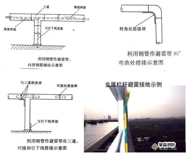 5、屋面金屬通氣管接地:采用鍍鋅扁鋼自屋面避雷網從透氣管根部引出,用抱箍沿透氣管固定,距根部或裝飾臺面間距300mm,根部與接地線連接,搭接長度不小于100mm,透氣管的連接部位做接地跨接。