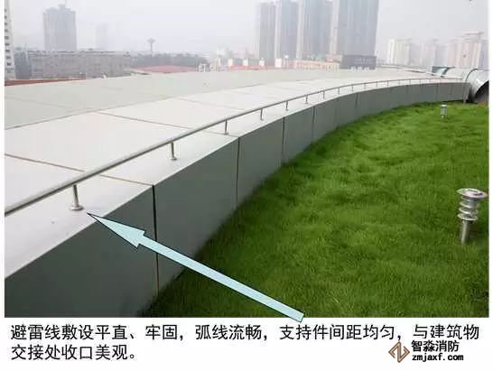 3、圓鋼避雷帶敷設:按設計位置彈線、定位,一般情況下,避雷帶應居女兒墻(屋脊)中心,當女兒墻寬度大于300mm時,支架布設于距外沿150mm處,距變形縫、轉彎300mm處設支架,直線段支架均勻分布,間距不大于1m;支架埋深不小于80mm,出女兒墻頂面不小于150mm,調整、校正支架的垂直度,根部套不銹鋼裝飾圈并用耐候膠密封固定。圓鋼調直后敷設在支架上,轉彎、搭接、變形縫處圓鋼煨彎加工,轉彎處煨彎半徑為80~100mm,搭接處一端鋼筋煨乙字彎,與另一端圓鋼上下搭接,搭接長度為100mm,搭接點宜設在離支架不小于200mm位置處,雙面施焊,焊縫連接飽滿,焊渣清理干凈,焊接點應先刷防銹漆,再刷銀粉漆,防腐處理到位;變形縫處鋼筋煨成向下半圓形。將防雷引下線可靠焊接在避雷帶上。拉通線校正避雷帶的高度、平直度。