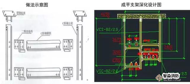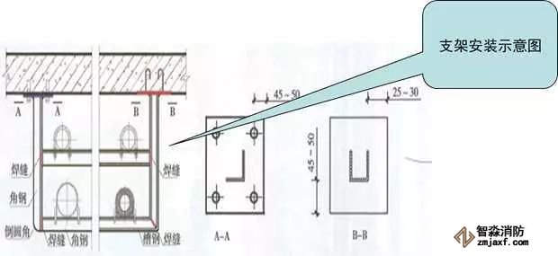 2)、固定支架宜設在主梁和次梁上,其設置方向應同于其他支架。固定支架伸入梁的長度不宜小于200mm,固定點每側不少于兩個,上部固定點距支架頂端不宜小于50mm,底部固定點距梁底端不宜小于50mm,固定點間距不宜小于100mm,所有型鋼支架尖角必須倒成圓弧角。