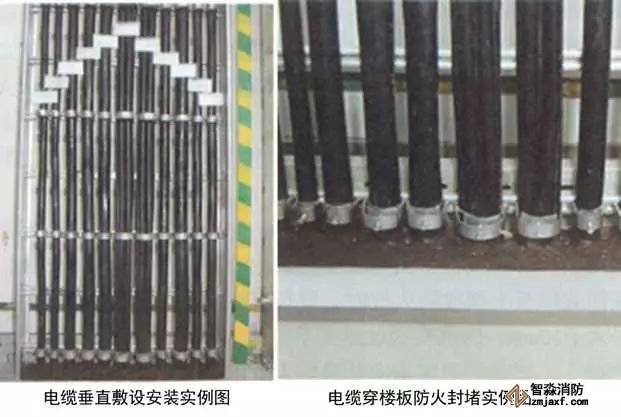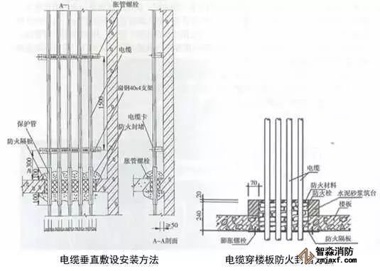 敷設前檢查電纜規格、型號、截面、電壓,外觀無扭曲、損壞,進行絕緣測試及耐壓試驗。采用機械放電纜時,應將機械選好適當位置安裝,并將鋼絲繩和滑輪安裝好;人力放電纜是將滾輪提前安裝好。電纜按順序擺放,排列整齊,盡量避免交叉。敷設時要按適當的間距加以固定,支架距離不得大于1.5m,放一根立即卡箍一根,穿越樓板可采用加設套管和防火枕兩種方式,敷設完成后應將套管與電纜間隙用防火堵料封堵嚴密,并且及時裝設標志牌。電纜進入豎井、盤柜以及穿入管子時,出入口及管口應密封。明敷在豎井內帶有麻護層的電纜,應剝除麻護層,并對其鎧裝加以防腐。