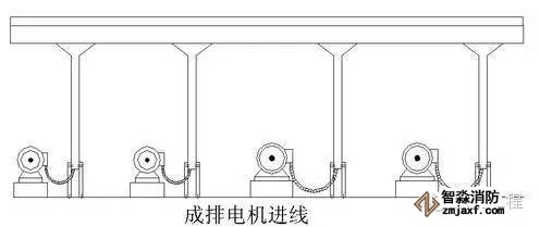 5.機房因為設備多,管線及橋架縱橫交錯,施工時應盡量做好綜合布置,成排電機橋架進線示意如圖: