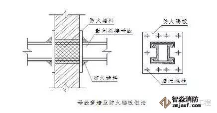 7.封閉插接母線在穿過墻及防火樓板時,在母線周圍填充防火堵料,具體做法見上圖。