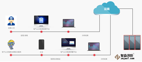 1、 基于物聯傳感、移動互聯、云計算技術及大數據等現代信息技術,由智能終端、無線傳輸設備,通過智能傳感終端(現場監控模塊、傳輸模塊),將引起電氣火災的主要因素(線纜溫度、電流、剩余電流、故障電弧)進行實時在線監測,統計分析,匯總為電氣安全數據實時傳送至云平臺;