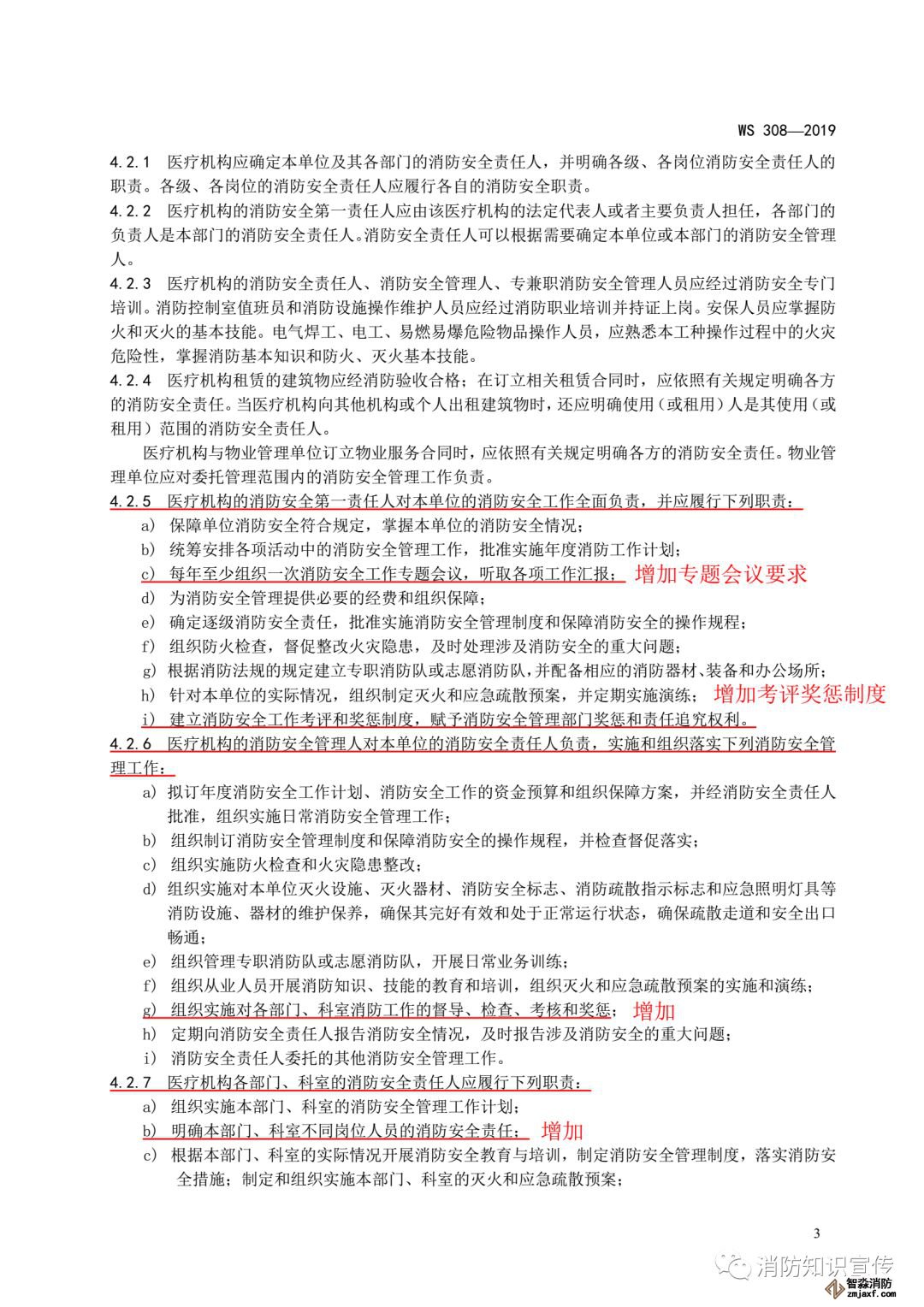 ——修改了各部門、科室的消防安全責任人的職責要求(見4.2.7, 2009年版的4.2.6);