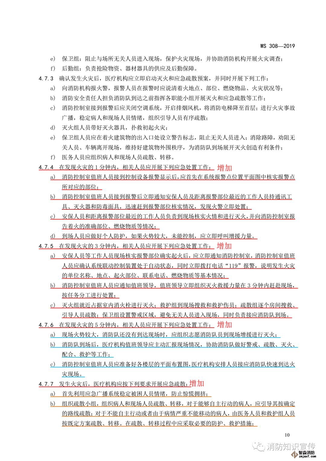 ——增加了發現火災的1分鐘內、 3分鐘內、 5分鐘內的應急處置工作要求和發生火災后醫療機構開展應急疏散要求(見4.7.4、 4.7.5、 4.7.6和4.7.7);