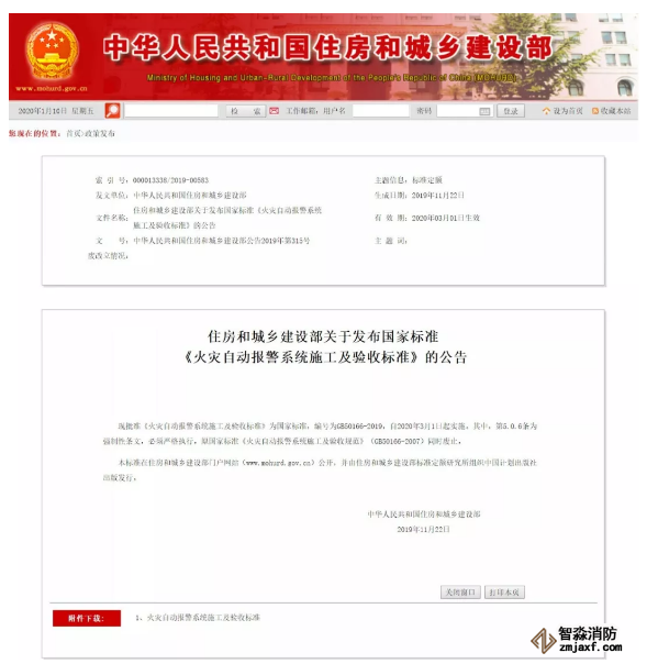 住建部公布了GB50166-2019《火災自動報警系統施工及驗收標準》,自2020年3月1日起實施。其中,第5.0.6條為強制性條文。原國家標準《火災自動報警系統施工及驗收規范》(GB50166-2007)同時廢止。