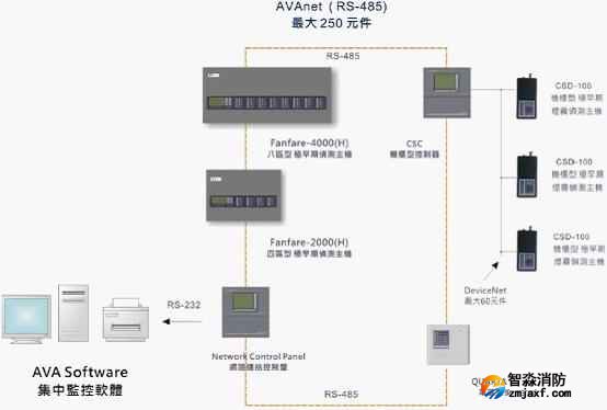 FANFARE-2000四區(qū)型極早期煙霧偵測(cè)主機(jī),可以通過(guò)輸入模塊接入火災(zāi)自動(dòng)報(bào)警報(bào)警控制器;也可以全部聯(lián)網(wǎng),并由AVA系統(tǒng)管理軟件對(duì)整個(gè)系統(tǒng)進(jìn)行設(shè)置和監(jiān)控。AVA系統(tǒng)管理軟件安裝在消防控制室的計(jì)算機(jī)上,用戶(hù)可以通過(guò)它對(duì)整個(gè)探測(cè)系統(tǒng)的所有性能進(jìn)行設(shè)置、調(diào)試和監(jiān)控。