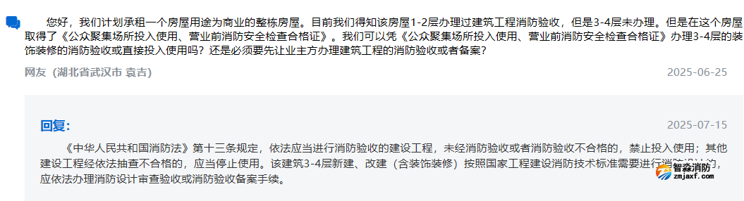 咨詢:您好,我們計劃承租一個房屋用途為商業的整棟房屋。目前我們得知該房屋1-2層辦理過建筑工程消防驗收,但是3-4層未辦理。但是在這個房屋取得了《公眾聚集場所投入使用、營業前消防安全檢查合格證》。我們可以憑《公眾聚集場所投入使用、營業前消防安全檢查合格證》辦理3-4層的裝飾裝修的消防驗收或直接投入使用嗎?還是必須要先讓業主方辦理建筑工程的消防驗收或者備案?