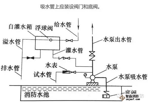 根據離心泵的特性,水泵啟動時其葉輪必須浸泡在水中。為保證消防泵及時、可靠的啟動,吸水管宜采用自灌式吸水。