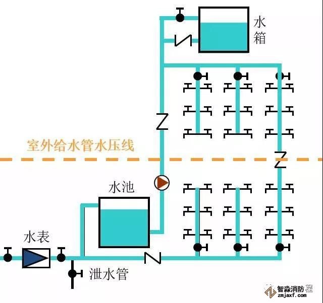 水壓經常不足,用水較均勻,且不允許直接從管網抽水時采用。