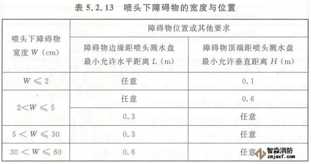 5.2.13 早期抑制快速響應(ESFR)噴頭與噴頭下障礙物的距離應滿足本規范圖5.2.12所示的要求。當無法滿足要求時,噴頭下障礙物的寬度與位置應滿足本規范表5.2.13的規定。
