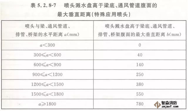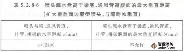 5.2.8 當噴頭濺水盤高于附近梁底或高于寬度小于1.2m的通風管道、排管、橋架腹面時,噴頭濺水盤高于梁底、通風管道、排管、橋架腹面的最大垂直距離應符合表5.2.8-1~表5.2.8-9的規定(見圖5.2.8)。