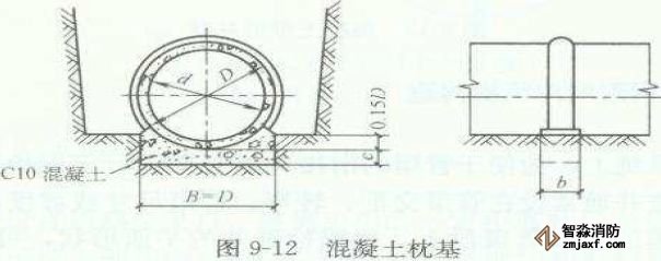 混凝土枕基是只在管道接口處才設置的管道局部基礎,如圖9-12所示。通常在管道接口下用C1O混凝土做成枕狀墊塊,墊塊常采用900或1350管座。這種基礎適用于干燥土壤中的雨水管道及不太重要的污水支管,常與砂土基礎聯合使用。