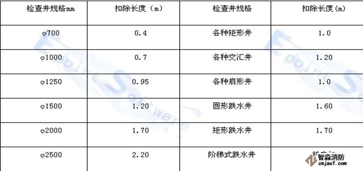 1、各種角度的混凝土基礎、混凝土管、缸瓦管鋪設按井中至井中的中心扣除檢查井長度,以延長米計算工程量。每座檢查井扣除長度按下表計算。