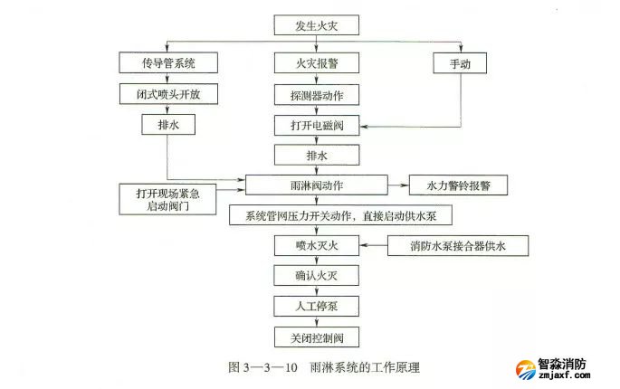 系統(tǒng)處于準(zhǔn)工作狀態(tài)時(shí),由消防水箱或穩(wěn)壓泵、氣壓給水設(shè)備等穩(wěn)壓設(shè)施維持雨淋閱入口前管道內(nèi)的充水壓力。發(fā)生火災(zāi)時(shí),由火災(zāi)自動(dòng)報(bào)警系統(tǒng)或傳動(dòng)管自動(dòng)控制開(kāi)啟雨淋報(bào)警閥和供水泵,向系統(tǒng)管網(wǎng)供水,由雨淋閥控制的開(kāi)式噴頭同時(shí)噴水。