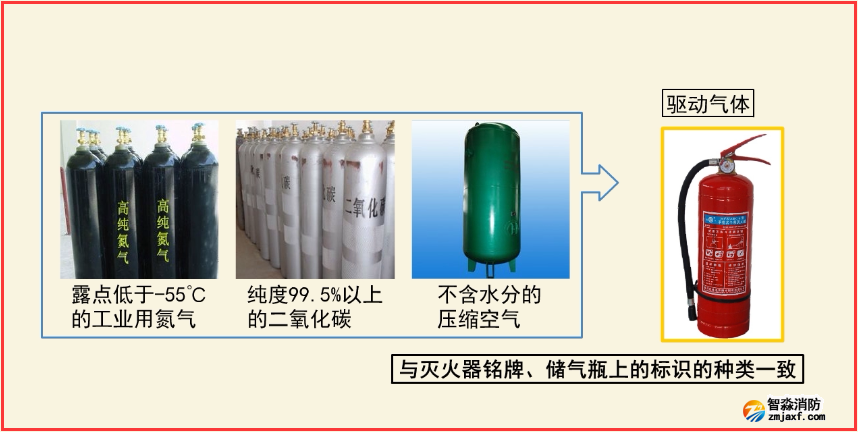 (6)儲壓式干粉滅火器和潔凈氣體滅火器可選用露點低于-55℃的工業用氮氣、純度99.5%以上的二氧化碳、不含水分的壓縮空氣等作為驅動氣體,但要與滅火器銘牌、儲氣瓶上標識的種類一致。