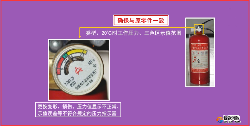 (5)更換具有嚴重損傷、變形、銹蝕等影響使用的缺陷的滅火器壓把、提把等金屬件;更換存在肉眼可見缺陷的儲氣瓶式滅火器的頂針。
