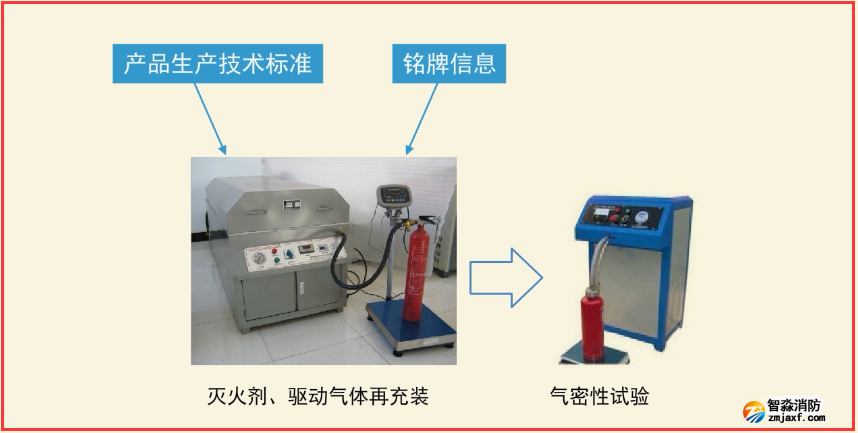 根據滅火器產品生產技術標準和銘牌信息,按照生產企業規定的操作要求,實施滅火劑、驅動氣體再充裝。再充裝后,逐具進行氣密性試驗;