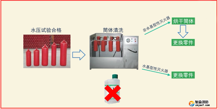 經水壓試驗合格的滅火器筒體,首先將其內部清洗干凈。清洗時,不得使用有機溶劑洗滌滅火器的零部件。然后對所有非水基型滅火器筒體進行內部干燥,以確保空滅火器內部潔凈干燥。