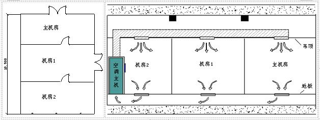 如下圖所示,若三個房間從吊頂到地板都采用獨立的空調系統,那么將機房1和機房2劃作一個區域或劃為兩個單獨滅火區都是可行的。但如果采用一臺精密空調為三個房間服務且為“上送風,地板下回風”方式這三個房間就必須劃分成一個滅火區域,藥劑儲備應該是上者的3倍或1.5倍,對工程的投資影響是比較大的。除過滅火劑和噴放管道布置要作為一個保護區考慮外,探測范圍也應該分塊進行探測但還是一個探測區域,警報區域也應該按照一個區域來設置和聯動。