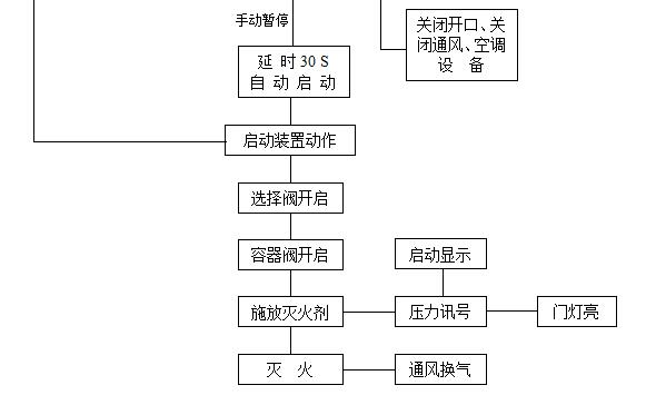 發生火災時,當一路探測器報警后,設在該防護區域內的警鈴動作;兩路探測器都報警后,設在該防護區域內外的蜂鳴器及閃燈動作;系統進入延時階段,控制盤完成相關設備的聯動控制。經過延時后,控制盤輸出24V直流信號電源啟動儲氣瓶組上的電磁閥,打開儲氣瓶組釋放滅火劑氣體,滅火劑沿噴射短管和噴頭輸送到防護區域滅火。如值班人員先于火災探測系統發現火情,當用手提式滅火器或其它移動式滅火設備無法撲滅火災時,可直接手動啟動來滅火。如發現是系統誤動作,或確有火災發生但僅使用手提式滅火器和其它移動式滅火設備即可撲滅火災,可按下設在防護區域門外的緊急止噴按鈕,可以使系統暫時停止釋放藥劑。如需繼續開啟氣體滅火系統,則只需松開緊急停止開關即可。